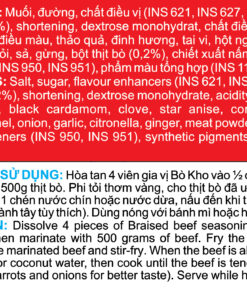 Muối, đường, chất điều vị (INS 621, INS 627, INS 631), mạch nha, shortening, mỡ bò (2%), dextrose monohydrate, chất điều chỉnh độ acid (INS 330), hột điều màu, thảo quả, đinh hương, tai vị, hột ngò, quế, tiểu hồi hương, hành, tỏi, gừng sả, bột thịt bò (0,2%), chiết xuất nấm men, chất tạo ngọt tổng hợp (INS 950, INS 951), phẩm màu tổng hợp (INS 110, INS 150a)