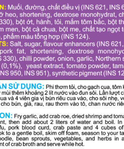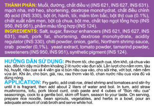 Thành phần: Muối, đường, chất điều vị (INS 621, INS 627, INS 631), mạch nha, shortening, mỡ heo, dextrose monohydrate, chất điều chỉnh độ acid (INS 330), bột ớt, hành, tỏi, mắm tôm bắc, bột thịt cua (0,1%), chiết xuất nấm men, bột cà chua, bột me, chất tạo ngọt tổng hợp (INS 950, INS 951), phẩm màu tổng hợp (INS 124)