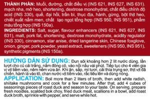 Muối, đường, chất điều vị (INS 621, INS 627, INS 631), mạch nha, mỡ heo, shortening, dextrose monohydrate, chất điều chỉnh độ acid (INS 330), quế, đại hồi, trần bì, thục địa, hành, gừng, bột thịt heo, chiết xuất nấm men, chất tạo ngọt tổng hợp (INS 950, INS 951), phẩm màu tổng hợp (INS 150a)